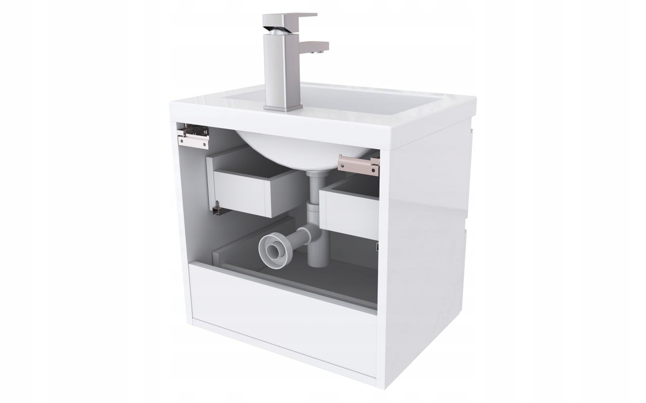 Nasze meble zaprojektowane są z myślą o bezpieczeństwie i trwałości. Wysokiej jakości materiały i regulowany mechanizm zawieszek umożliwiają wygodną instalację i bezproblemowe dopasowanie. Nasze zawieszki wytrzymują obciążenie do 65 kg każda, co czyni je idealnym rozwiązaniem. Miejsce na syfon oraz około 72 mm przestrzeni od końca szuflad do ściany zapewnia możliwość doprowadzenia bez problemu odpowiednich złączy.